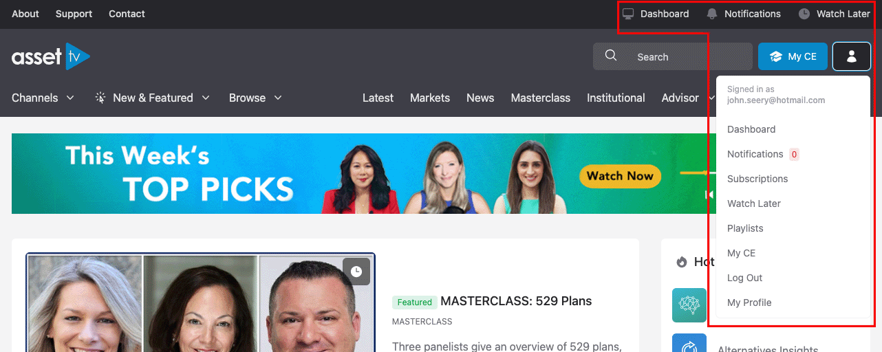We've introduced exciting new features to help you get the most out of Asset TV! To access them, simply sign in using your email and password. Once you're logged in, you'll find the new features menu conveniently located in the top right corner of the page: