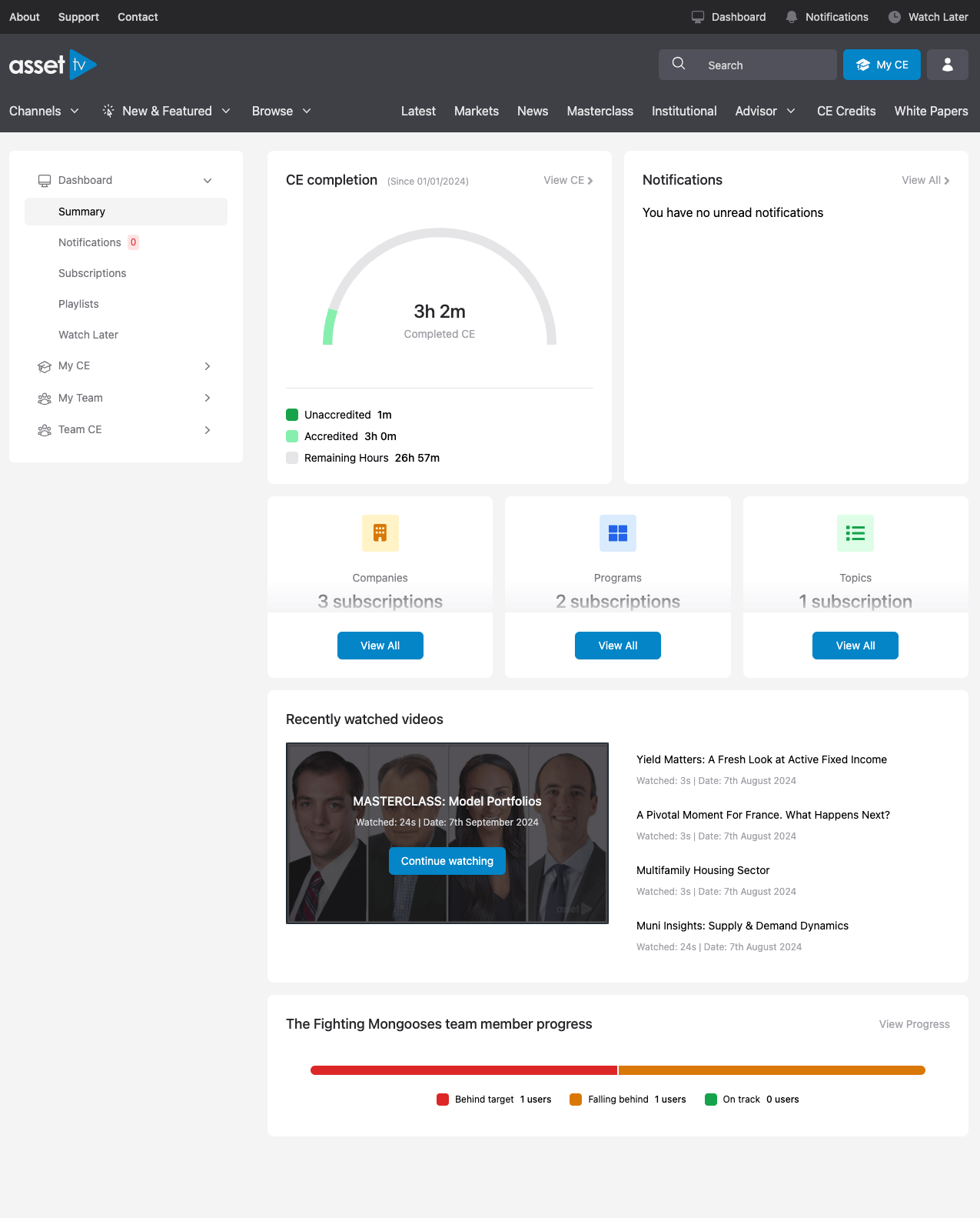 Your Dashboard is your central hub for all things Asset TV. From here, you'll get a quick overview of your activity and account. You'll also find direct links to easily manage: