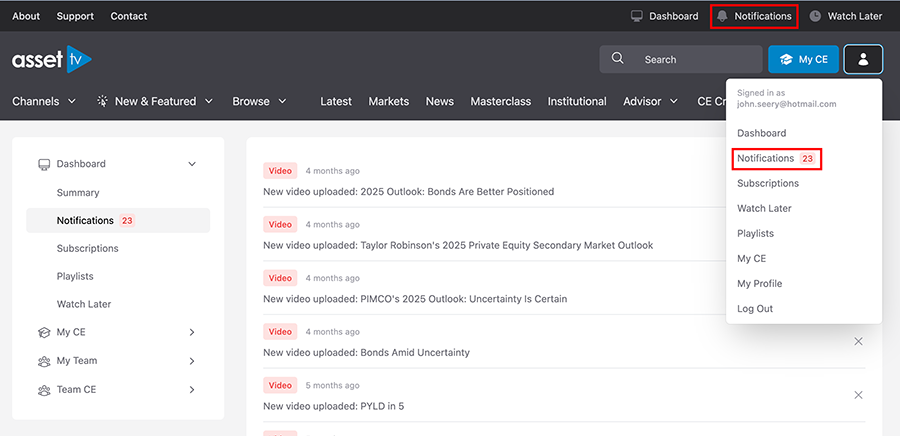 You'll receive notifications whenever new content is published to the channels you're following. You can conveniently access these notifications from your dashboard menu.